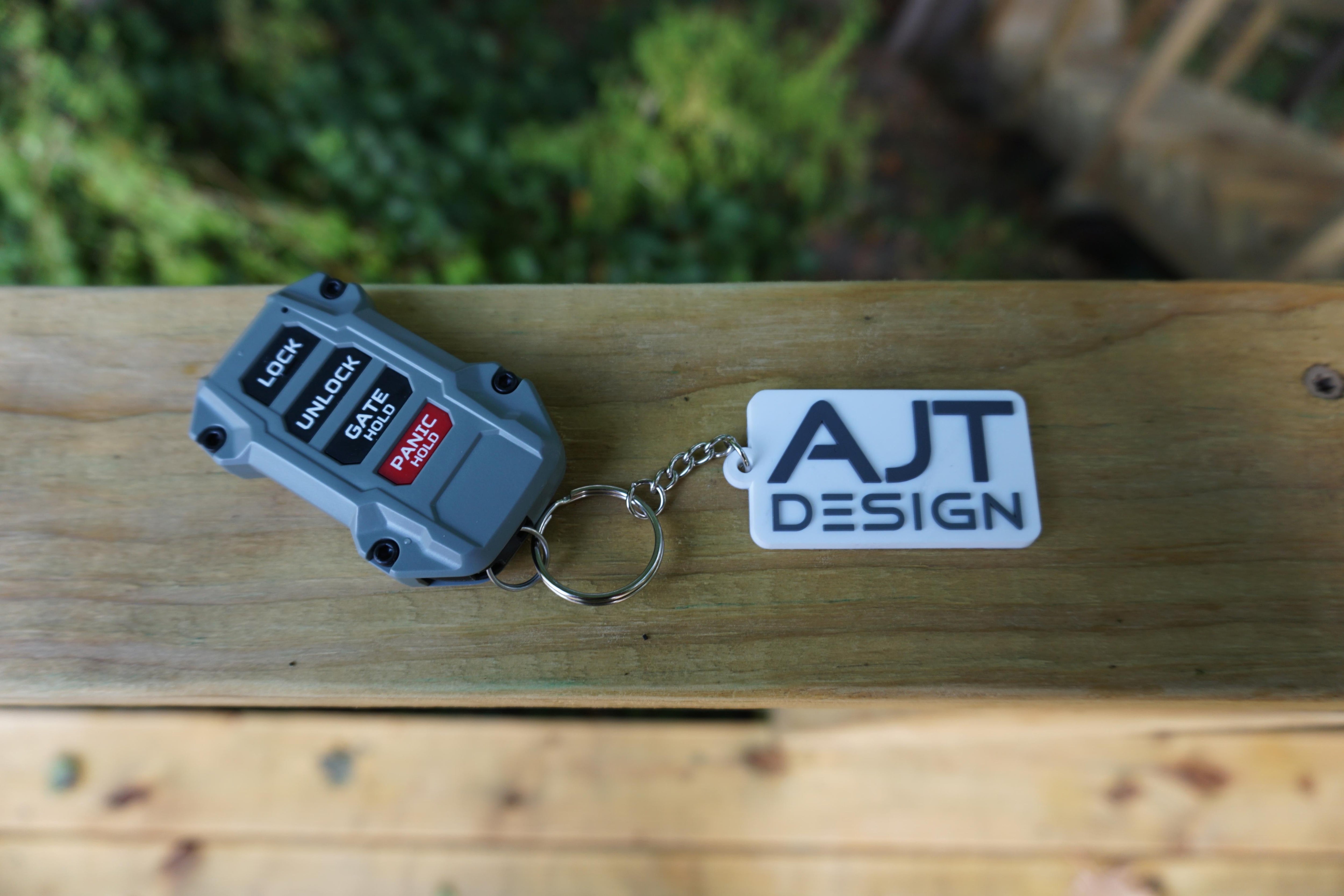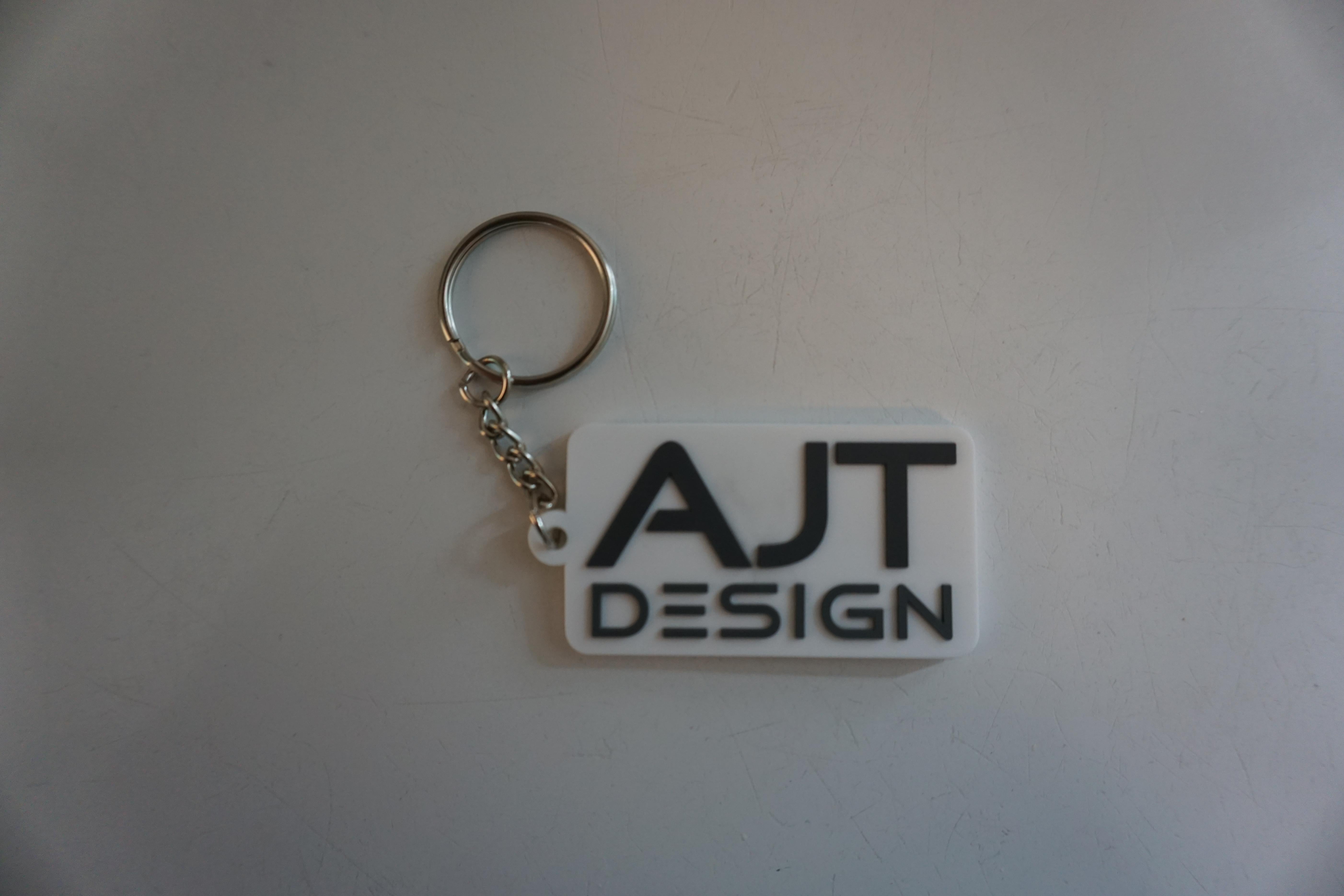 Rubber keychain with the AJT DESIGN logo.
