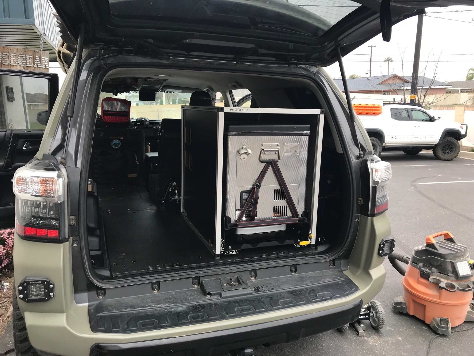 The Goose Gear CampKitchen2.4 is the largest of our CampKitchens designed to house your fridge and your stove in one convenient Module. Featuring a double slide operation, you can open the fridge and/or the stove slide independently or combined.