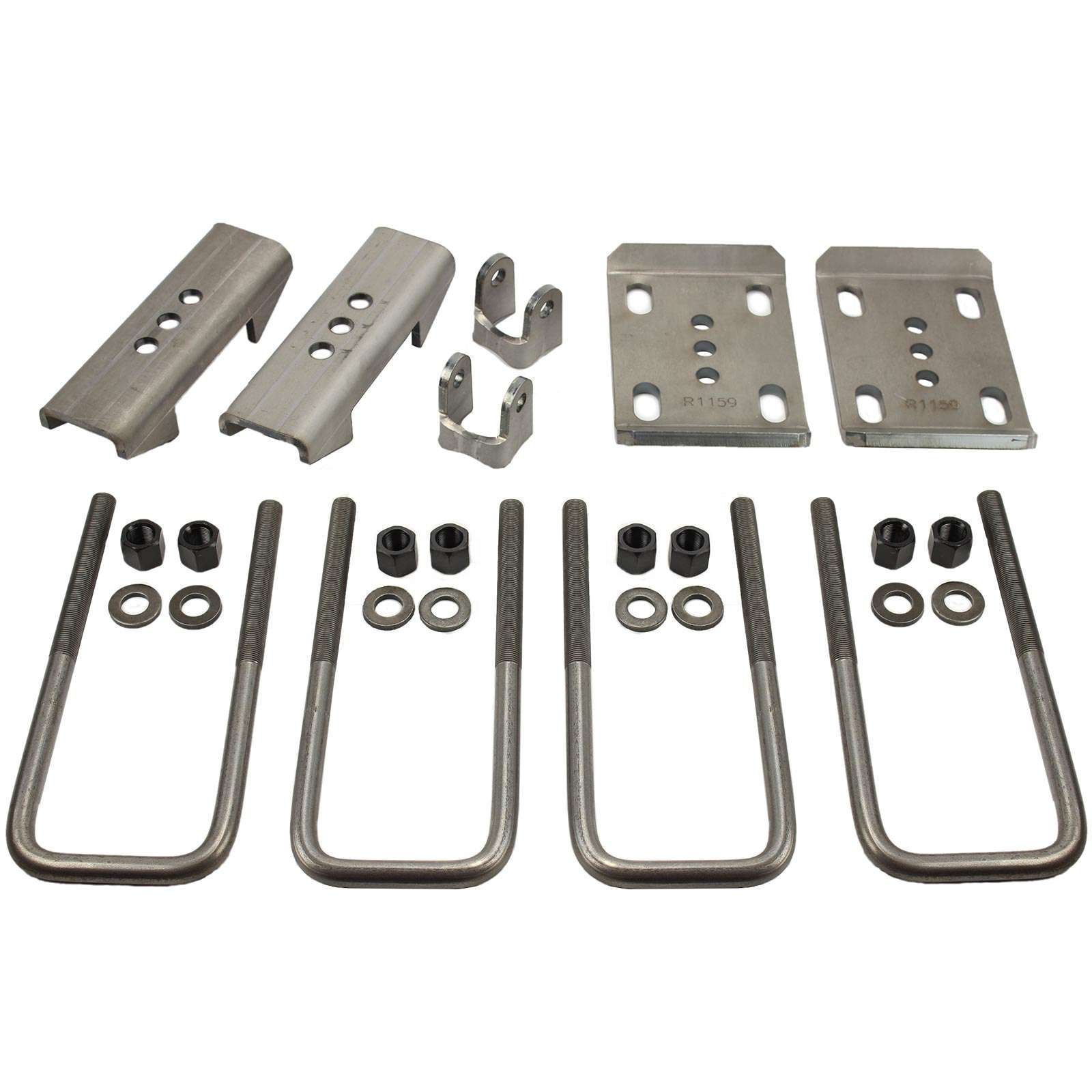 Kit includes 3/8" thick A50 steel U-bolt plates with 3-pin mounting options, matching Rockwell spring perches, flat bottom U-bolts with hardware, and shock brackets. All components are laser cut and built to handle the weight and stress of Rockwell axles in demanding off-road conditions.