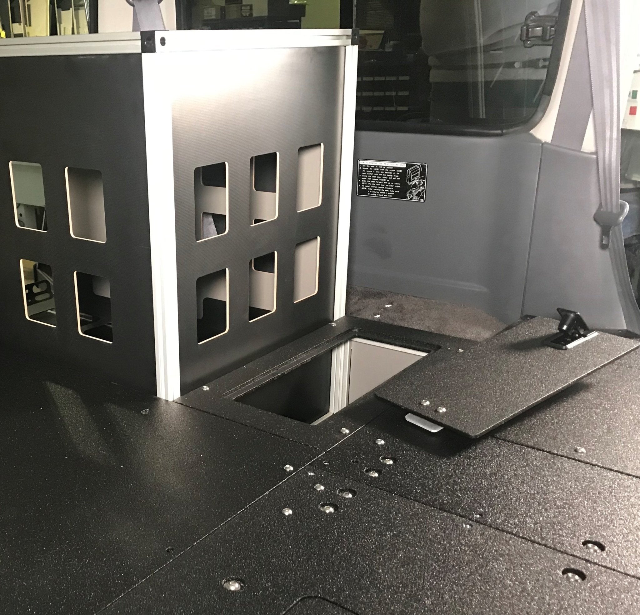 Includes lockable hatch door that is coated in bed liner material to match our other plate system products.