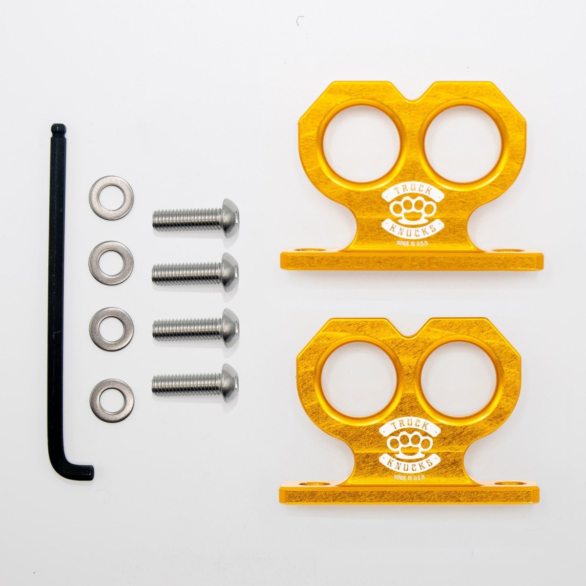 Make a statement with the Gold Two Knuck, where craftsmanship meets attitude. Precision CNC-machined from anodized billet aluminum, this two-finger brass knuckle–inspired tie-down point replaces OEM bolt on tie-downs on the truck bed wall for Toyota Tacoma and Tundra. Its gold anodized finish not only turns heads but also delivers superior protection from corrosion and wear. With two tie-down points built into its sleek design, the Gold Two Knuck is built to perform—and made to stand out.