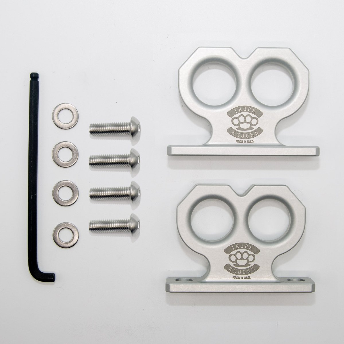 Meet the Two Knuck: a bold, two-finger brass knuckle-inspired tie-down point for Toyota Tacoma and Tundra. Precision CNC-machined from billet aluminum, tumbled finish and clear anodized for corrosion resistance and added durability, the Two Knuck offers both rugged style and exceptional functionality. With two separate tie-down points cleverly integrated into its design, the Two Knuck is perfect for securing your gear while making a statement.